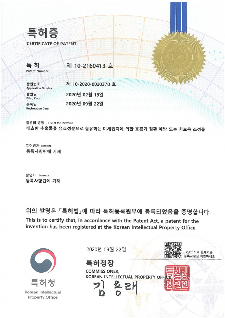 배초향 추출물을 유효성분으로 함유하는 미세먼지에 의한 호흡기 질환 예방 또는 치료용 조성물 |